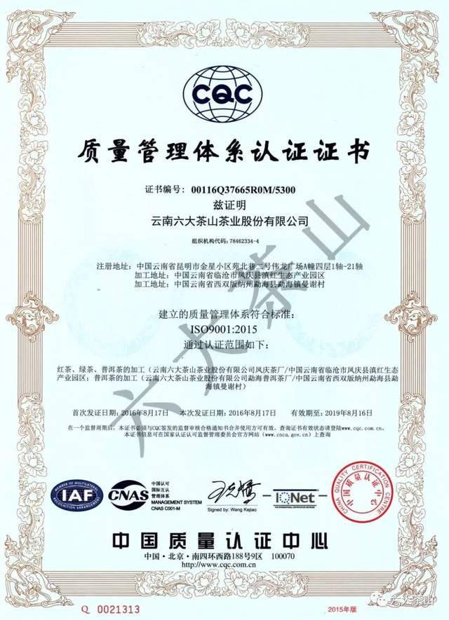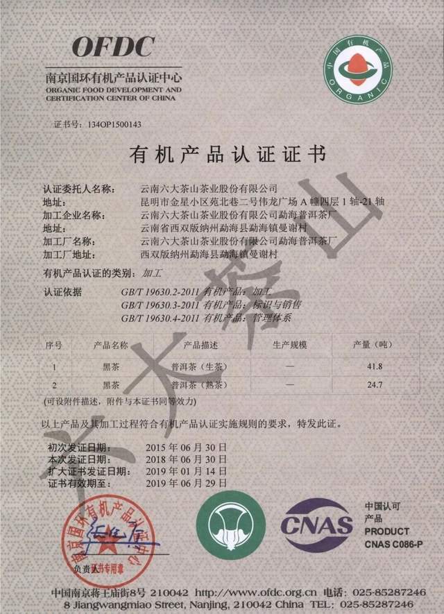 歷年來,六大茶山公司獲得國家有機食品認證,通過SC認證、食品出口衛(wèi)生注冊登記,云南省10大名品、云南省老字號、有機產(chǎn)品認證企業(yè)、出口食品生產(chǎn)企業(yè)、中國茶葉行業(yè)百強企業(yè)、云南首批年份普洱茶質(zhì)量保薦溯源企業(yè)、云南首款曬青茶質(zhì)量保薦溯源企業(yè)、HACCP體系認證企業(yè),通過ISO9001質(zhì)量管理體系認證,ISO22000食品安全管理體系認證。